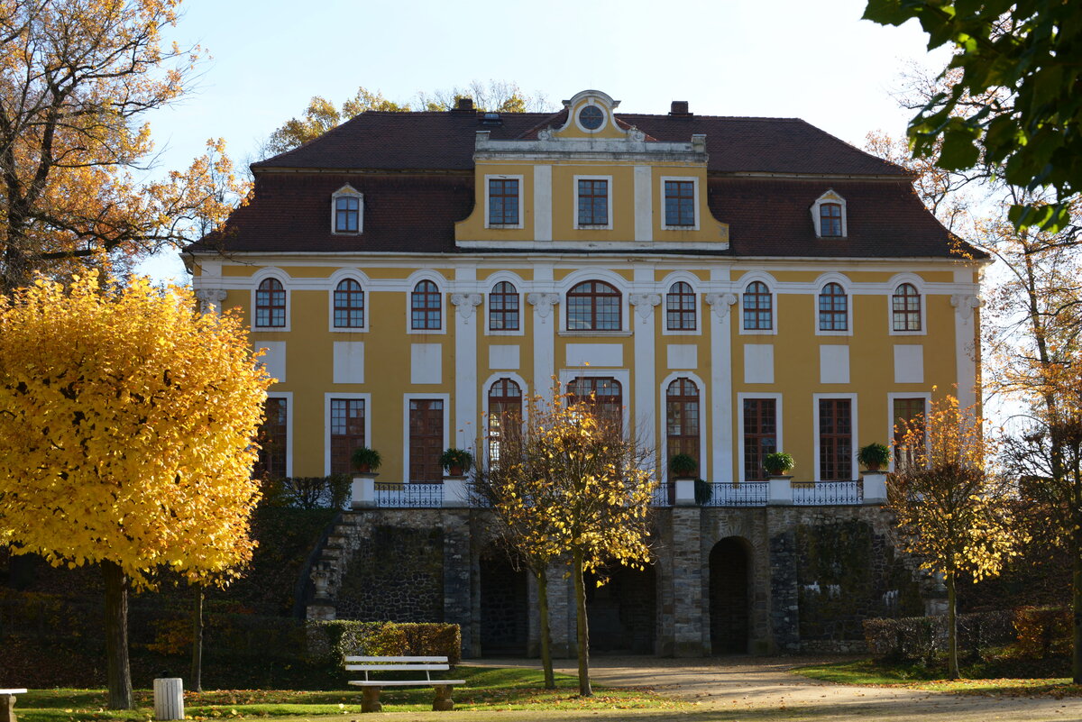 An Stelle einer mittelalterlichen Wasserburg ließ Herzog Friedrich Ludwig von Württemberg-Teck, der Generalfeldzugmeister im Dienst August des Starken das Schloss in seiner heutigen Form als Sommerresidenz für sich und seine Gemahlin, die Reichsfürstin Ursula Katharina von Teschen, gesch. Lubomirska polnische Mätresse August des Starken, erbauen. In symmetrischer Anordnung entstanden dazu vier Pavillons.